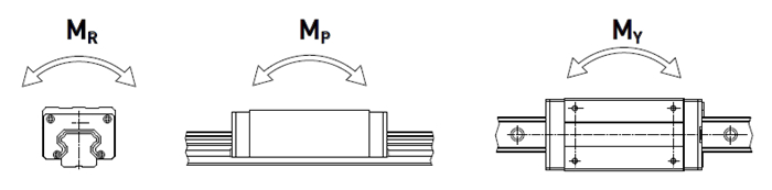 當滑塊中受到最大應力的鋼珠達到上述定義之靜額定負荷時,此時滑塊所承載之力矩稱為靜額定力矩。在上銀導軌運動中是以MR、MP、PY這三個方向來定義