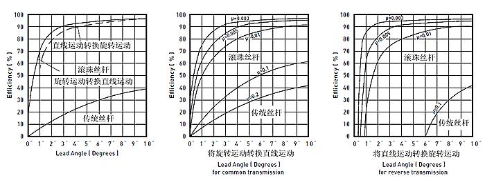 由于上銀滾珠絲杠的絲桿軸和螺帽均是點接觸的滾動運動,所以具有90%以上的高效率。因此其傳動扭矩僅只有傳動絲桿的1/3。由下圖可以看出滾珠絲桿的機械效率高于傳動絲桿。