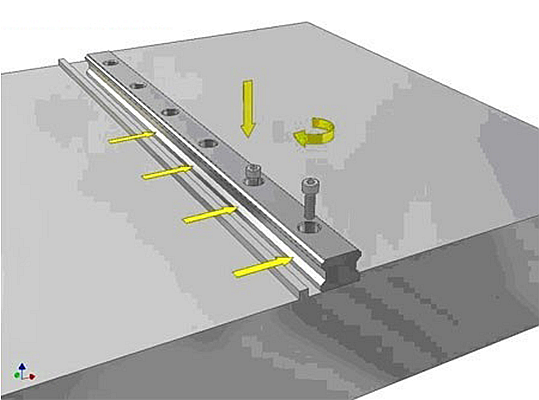 步驟.2:將主軌輕輕安置在床臺上,使用側(cè)向固定螺絲或其他固定治具使線軌與側(cè)向安裝面輕輕貼合。
